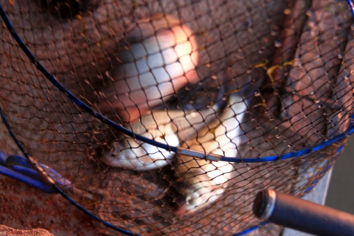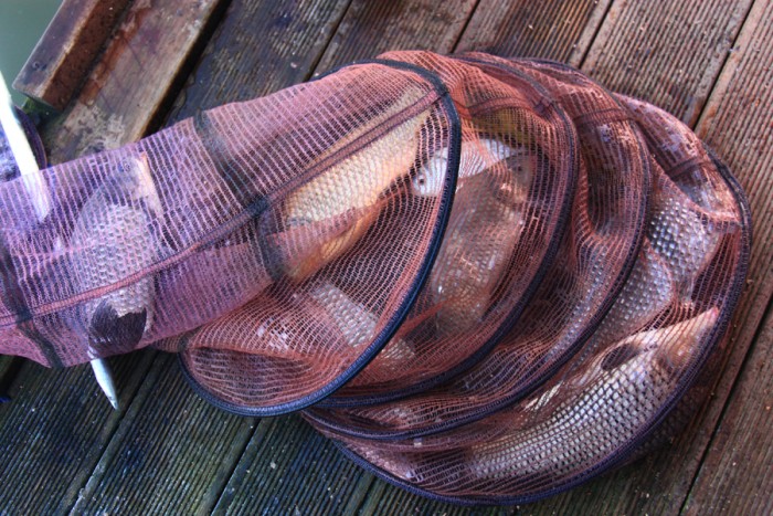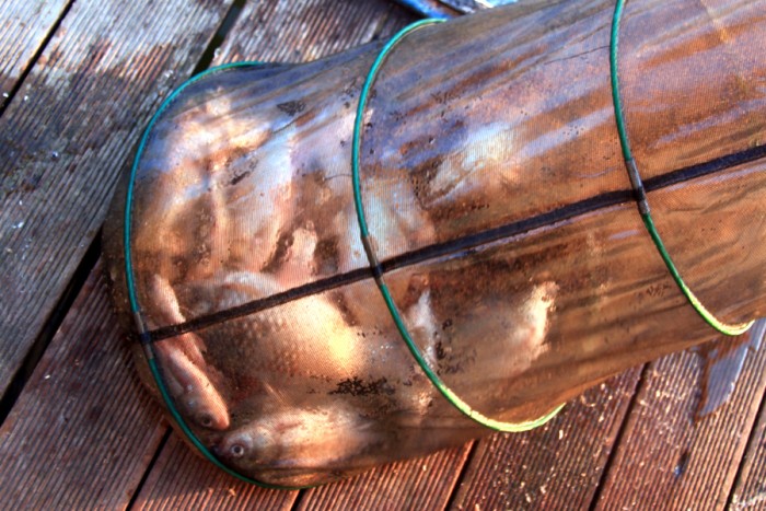 조과 보여 주려고 살림망을 드는데 수면위에 잔뜩 보이던